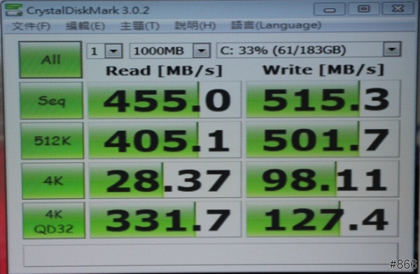 第一個是SSD數據,下面這張圖是一般SSD測試的數據,相信大家在電腦王或T客邦都有看過。
