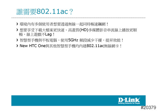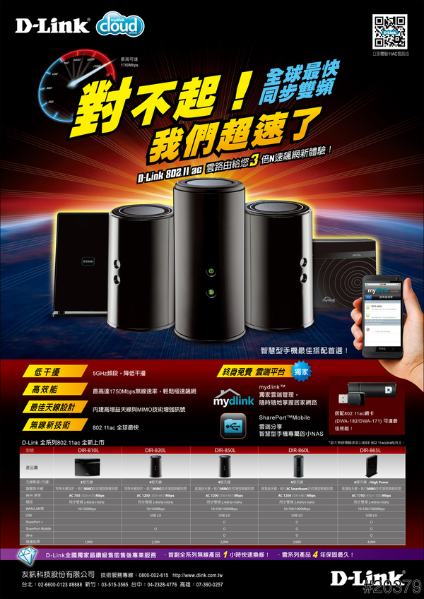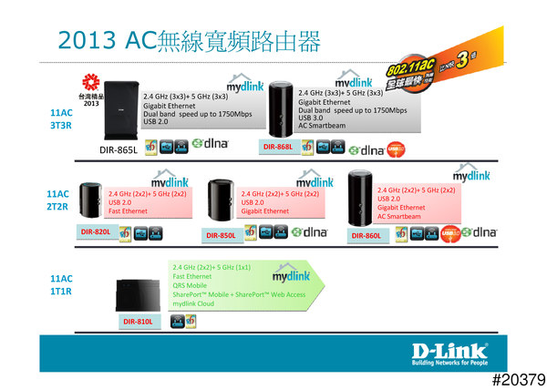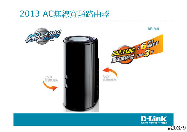 因應大量資料傳輸、無線上網需求不斷攀升之趨勢,為了使智慧型手機、平板電腦、筆記型電腦、PC能夠更順暢的進行線上影音串流與線上遊 戲,D-Link推出採用11AC技術之無線路由器使無線傳輸效能更快更穩定!2012年底D-Link率業界先聲推出1750Mbps 11AC雲路由DIR-865L震撼市場之後;直至2013年初廠商始推出採用1T1R的11AC智慧型手機,而進階之2T2R平板電腦/筆記型電腦亦預 計在2013年下半年隆重登場。為了滿足多種3C 設備對於11AC的需求,D-Link推出業界最完整齊備的11AC解決方案AC750 (DIR-810L)、AC1200(DIR-820L、DIR-850L、DIR-860L)、AC1750(DIR-868L)供消費者輕鬆選購。此 外,消費者如果無11AC終端設備,亦可購買11AC網卡AC750(DWA-171)與AC1200(DWA-182)體驗802.11ac極速飆網快感!