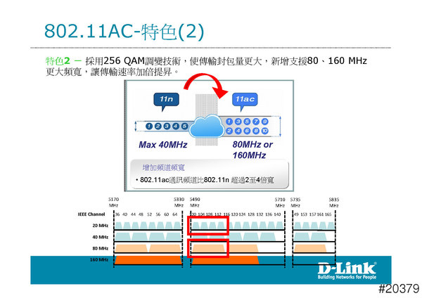 3.11AC採用256 QAM(Quadrature Amplitude Modulation)調變技術,使傳輸封包量更大,除原有的20MHz、40 MHz頻寬,還新增支援80 MHz、160 MHz更大頻寬,讓傳輸速率加倍提昇。