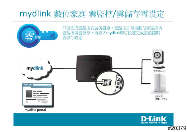 只要完成雲路由安裝與設定,雲路由即可自動偵測區網內雲監控與雲儲存,再登入mydlink即可快速完成雲監控與雲儲存設定!