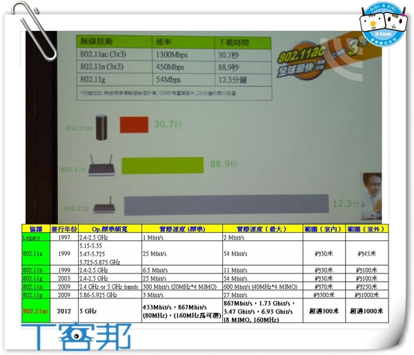 【▼】認識802.11ac和其他無線通訊協定的比較,簡單來說就是速度最少快3倍、傳輸範圍也越廣。