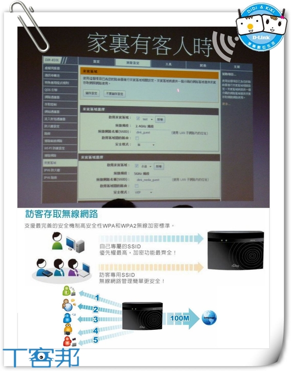 筆者以前唸書住在外面,常常會遇到把頻寬整個榨乾的室友,當時我想他也許生意作很大吧!後來才知道他常使用P2P軟體,加上又沒設定限流,導致我開個BBS都會Lag;幻想要是當初房東能早點參加本次體驗會的話,就不會發生速度Lag到比撥接還慢的慘劇。當然那時是屬於有線的網路環境,隨著無線技術的進步,完全改變了人類的生活,還記得第一次接觸無線網路設備只是為了拼Wii瑪莉歐賽車的世界排名,真的超瘋狂的。現在行動裝置越來越多樣化,包含了手機、平板等,趨勢已從被動接收的網路卡逐漸到主動發射的無線路由器,轉變成家庭網路的核心,在家裡任何地方都可工作及玩樂,不用再擔心網路線佈線美觀的問題。 無線產品上百款,擁有得獎無數的D-Link,絕對是挑選的最佳選擇。