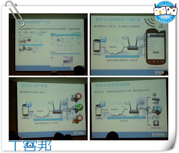 【▼】Emma第二個主題是說明D-Link雲端平台mydlink,這平台不但可遠端監控、管理、儲存和分享,對於頻寬也能有效的管理與分配;此外郭董曾經說過:「魔鬼就在細節裡」,網路速度快,也就代表風險越高,若是有駭客入侵,機密資料可能幾分鐘內就全被下載走了,所以mydlink不但可以用戶管理,,可即時知道用戶瀏覽記錄,對於駭客入侵也能第一時間簡訊告知,讓使用者馬上阻絕該連線,確保萬無一失。