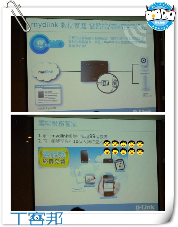 【▼】接著等待我們的是雲端家庭享樂區,這一區主打的特色是D-Link終身免費的雲服務,而雲服務包括了有雲路由、雲監控、及雲儲存,這些設定都不難,只要裝好mydlink,安裝精靈就會指引到最後完成的設定。本區展示的王者是DNS-327L 多媒體儲存分享中心配合柏青哥推薦的DIR-810L,恰到好處。