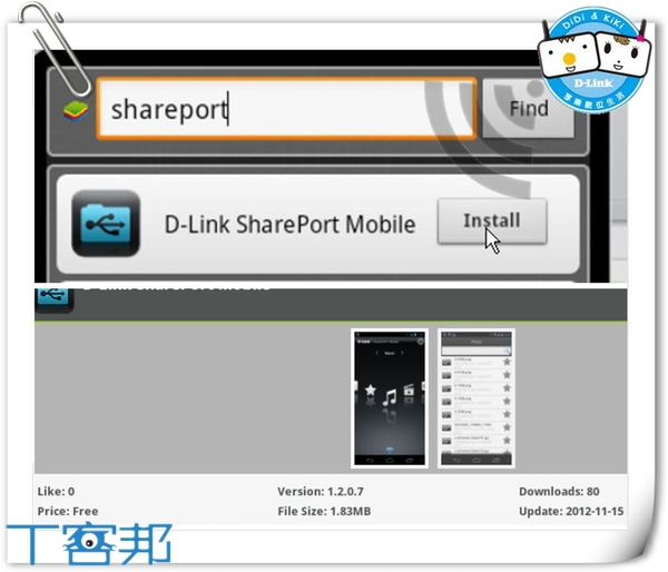 【▼】接下來跟著隊長Setp By Step做就對了,先在平板上打SharePort Mobile App找尋,沒意外第一個就是了,目前版本是1.2.0.7點擊並安裝它。