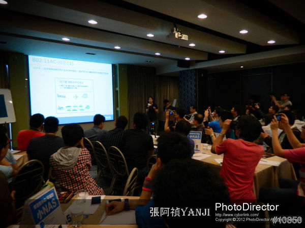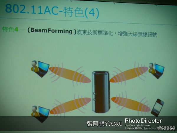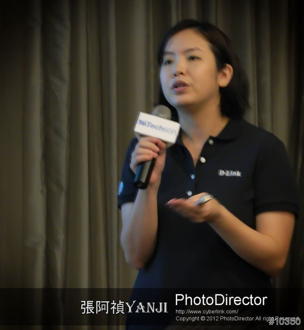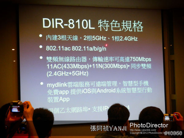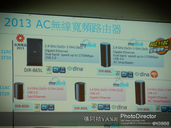 再來是D-Link產品經理Emma上台發表簡報:針對無線網路規範修正及升級,會有越來越多行動裝置支援新一代的高速網路IEEE 802.11ac(俗稱5G WiFi),而D-Link己經推出穩定的雙頻產品(相容IEEE 802.11n+IEEE 802.11ac),可以支援現在所有無線網路設備,也能相容未來產品。