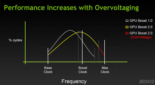 在GeForce GTX 680推出時導入了第一代GPU Boost,這項智慧自動超頻的新穎技術打破顯示卡的傳統設計,要了解GPU Boost的運作方式並不難,由於GPU的流處理器數量多,因單程式的數量不同,同時間平行運算的核心數量也不一致,因此顯示卡無法達到原始設計的最大TDP,簡單來說就是無法達到最大效能。為了讓顯示卡達到最大的運作效能,透過GPU本體的線路設計以及VBIOS的程式編寫,並且監控GPU運作時的實際TDP,再利用與最大TDP之間的剩餘TDP來提升CUDA時脈,再根據核心溫度來適當調整時脈,不浪費一點一滴的TDP來進行自動超頻,所以當時脈控制器將頻率送進核心裡面,雖然所有核心都會提升時脈,閒置的核心依舊是閒置,但運算中的核心卻又可以提升處理的速度,最後讓輸出的總效能和所有核心都滿載是一樣的TDP,如此一來就不會因為達不到額定的TDP而浪費效能,不可否認這是一個聰明且又能發揮GPU效能的設計,這就是GPU Boost!