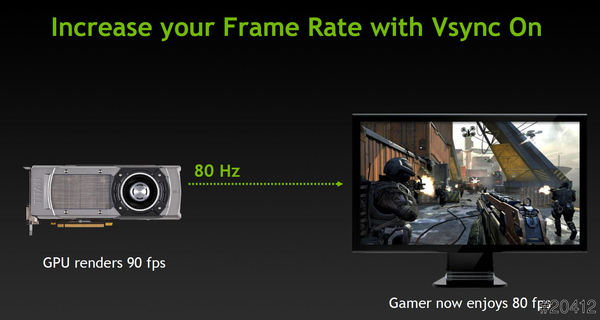 GPU Boost 2.0不但只是提高了動態超頻能力,還導入了「螢幕超頻技術」,有許多電腦玩家在進行遊戲時會開啟V-Sync(垂直同步),避免顯示卡輸出的FPS大於顯示器的更新率,而產生畫面撕裂破圖,較早期的螢幕的更新率為60Hz,所以如果開啟V-Sync那麼顯示卡就會將遊戲畫面限制在每秒最大60FPS。但是現今的液晶螢幕技術提升,多數較新的螢幕支援60Hz以上更新率,更新率越高當然也能減少遊戲畫面的延遲,所以透過GPU Boost 2.0可以偵測到螢幕最高更新率,在效能足夠的條件下輸出相對的FPS,如此一來玩家在進行遊戲的過程就能更加流暢!
