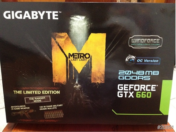 GIGA GEFORCE GTX 660採簡易的配件包裝,當然價格也會略低其他產品一些,加上內附Metro Last Light,我想此次二號機的新卡挑選,非它莫屬.