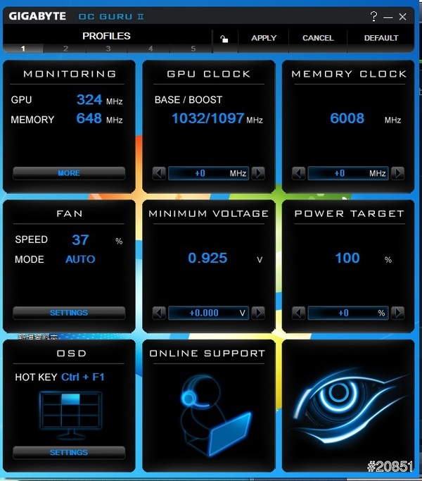 ◎技嘉的OC GURU II採直覺式的操作,無論是電壓,核心/記憶體電壓時脈及風扇控制,都可以在這完成,但不知道直接加壓,會不會把卡燒了!後來經朋友驗證,是有保護設定.