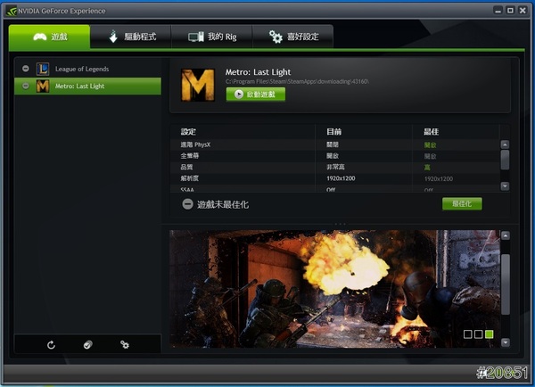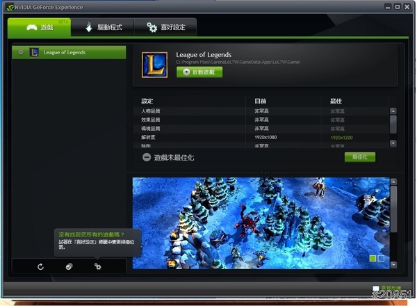 驅動光碟內,附了Geforce Experience軟體,似乎可針對電腦內的遊戲優化,順手裝來試試.嗯,根據建議優化的結果,雖然用的是I5 3570K的CPU,但整體的效果還不賴,感覺不太出來有LAG.