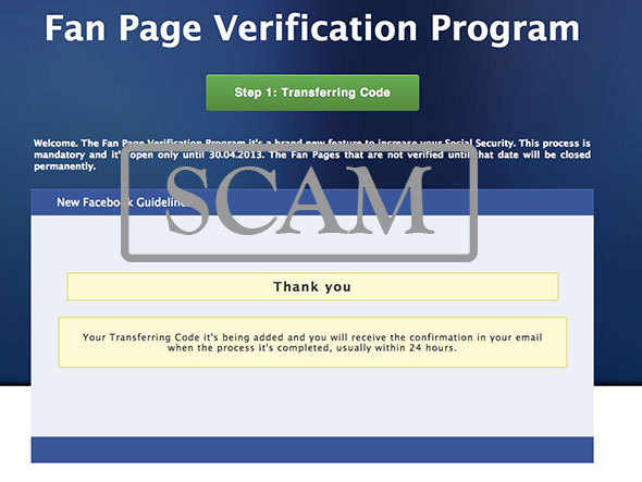 跟據國外網站 allfacebook.com 報導,目前出現假的釣魚網站,企圖利誘粉絲團專業管理員透過輸入10位數數字,來進行粉絲頁認證計畫,不過當你輸入資料的同時,可能也把你粉絲專業的資料都拱手送給別人了!假的釣魚網站,會傳播以下的訊息給粉絲團管理員,強調認證服務是強制執行,如果不在2013/5/30前完成資料輸入,那你的粉絲專業可能永久消失。