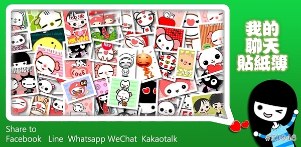 - 利用我的聊天貼紙簿內的分享功能,可以將眾多表情分享到LINE, WhatsApp, KakaoTalk, 微信, Facebook等社交平臺上!