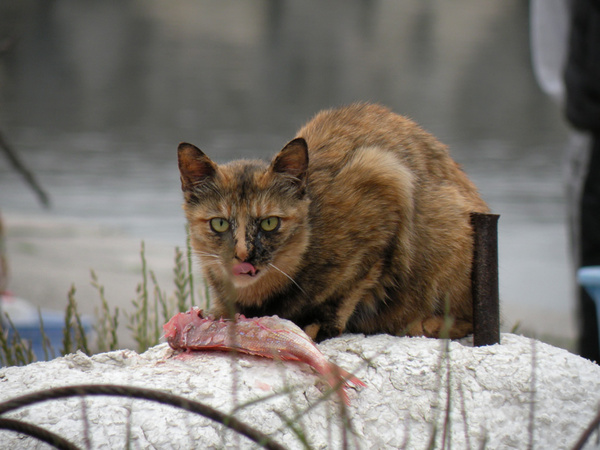 島上住有許多家貓和野貓,會成群跟釣客要魚吃。