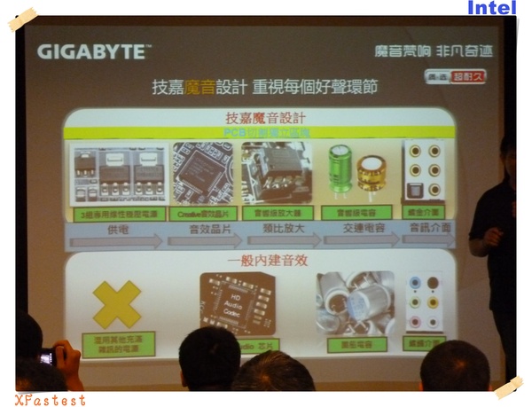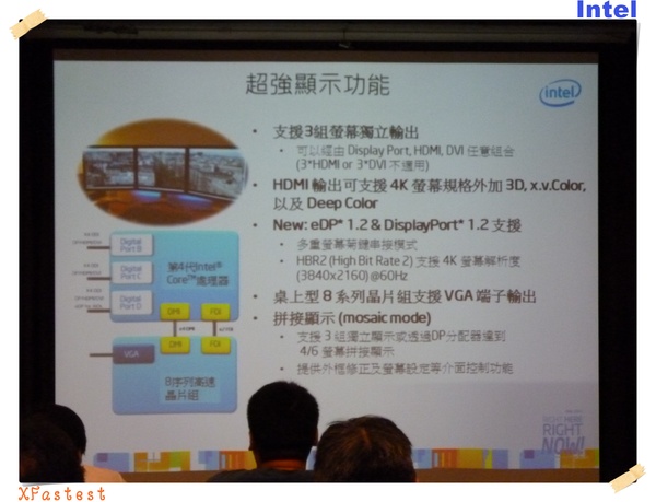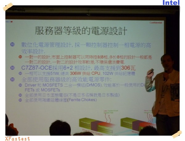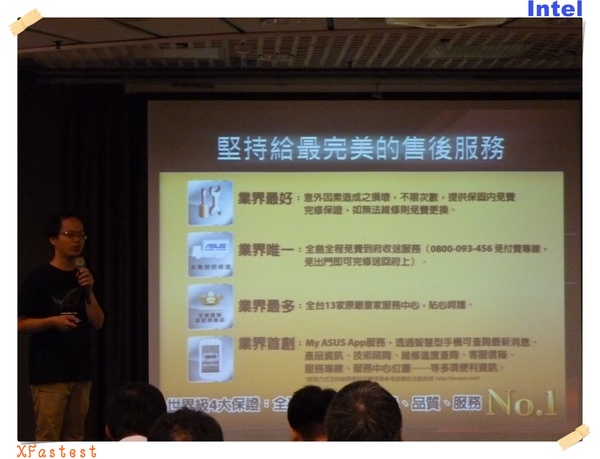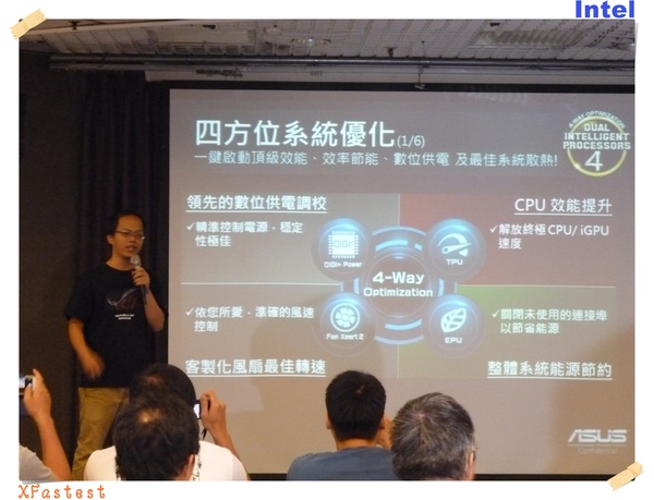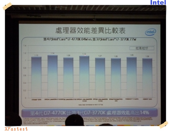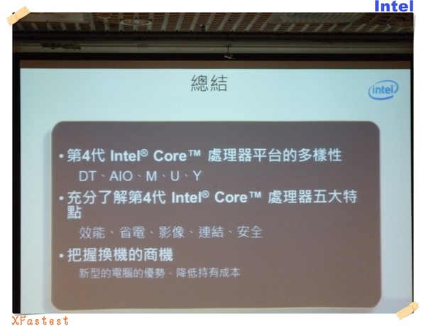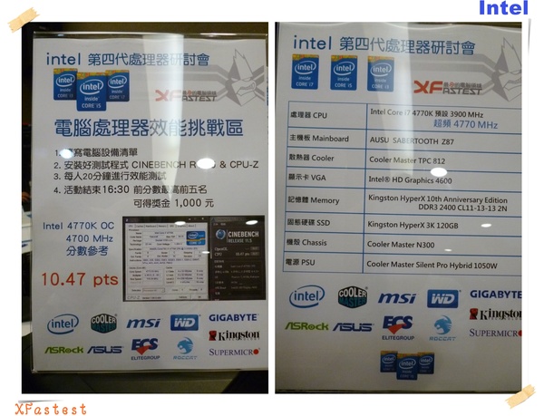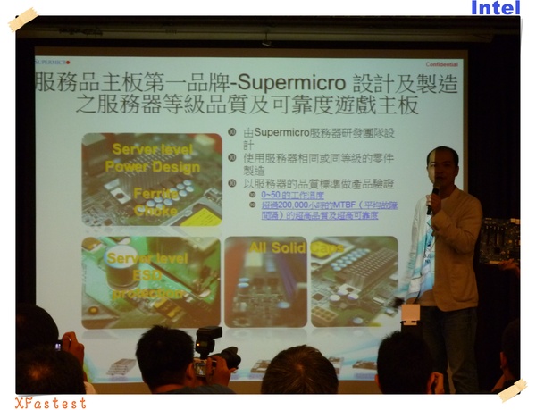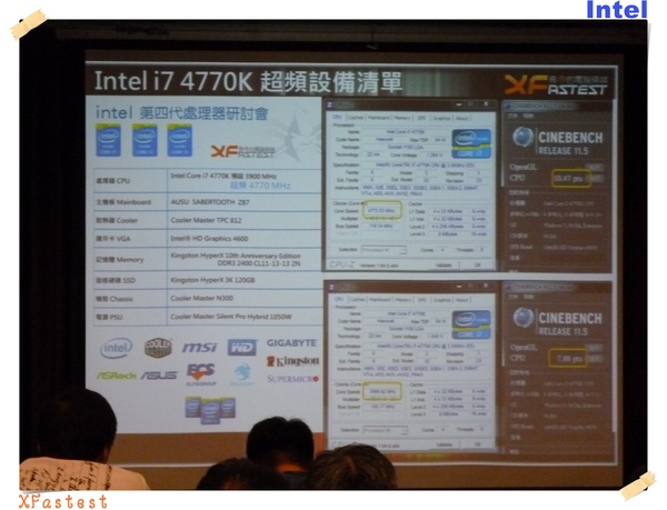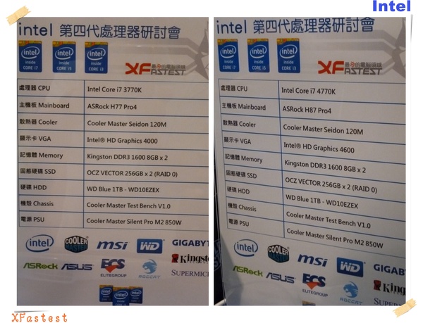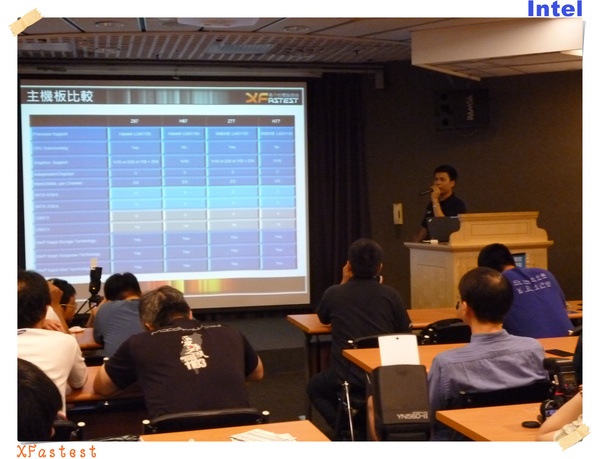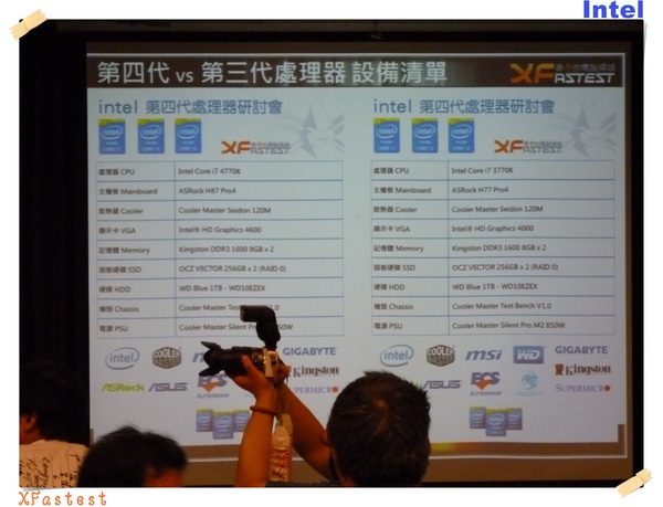 此次由XF和Intel用心主辦的Intel第四代處理器研討會,上半場經由Intel代表Jim的解說,讓大家認識剛發表不久的Haswell處理器,雖然在架構上不是全新的製程,但是精進了微架購,讓(Intel HD Graphics)內顯核心效能更高及功耗更低,以同樣的製程來說,真的很難得可貴,透過和競爭對手及自家前一代產品的實機測試,種種跑出來的數據都足以證明Haswell處理器不是過渡期的產品,尤在影音轉檔特別出色,重度影音玩家可不能錯過。下半場在時間有限的情況之下,每家廠商都努力推薦著自家的新產品,有專作硬碟的WD、記憶體的金士頓、注重電競產品的ROCKCAT、致力於機殼、Power及散熱王者的CoolerMaster,一線主機板大廠華碩、華擎、精英、微星、技嘉及美商Super Micro更是主推自家用料最頂級等,每位講師在台上講得口沫橫飛、欲罷不能,真的是有夠過癮!最後各協力廠商大力贊助的精緻好獎,更讓這場研討會增色不少。