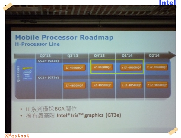 【▼】行動裝置處理器(H系列)未來上市時程表:Intel Core i7及i5.Inside,H系列僅採用BGA封裝,並內建Intel Iris graphics (GT3e)顯示晶片。