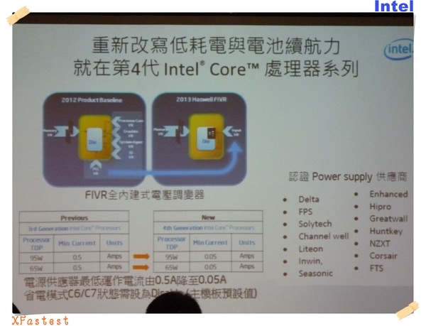 【▼】電源管理部分則採用全新FIVR架構,內建式電壓調變器,讓最低運作電流由0.5A降至0.05A,減少不必要的耗電,進而提高電池續航力;而桌上型處理器要能達到這些效能,還得配合有Intel認證過的電源供應器,才能相得益彰。