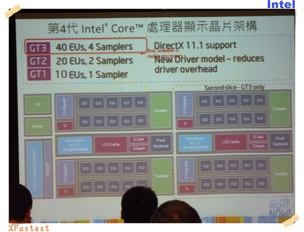 【▼】第四代Intel core處理器顯示晶片架構,最Top的GT3架構上擁有40Eus及4個Samplers。