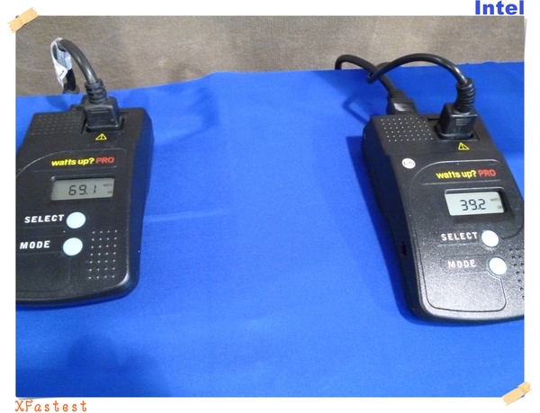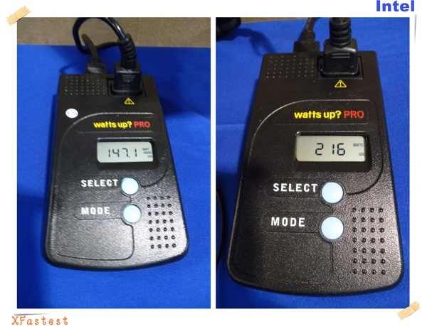 【▼】以遊戲現場實機測試,Intel i5-4430(左)功耗僅147.1Watts,AMD FX-8350(右)功耗為216Watts,Intel節能了有70Watts以上。