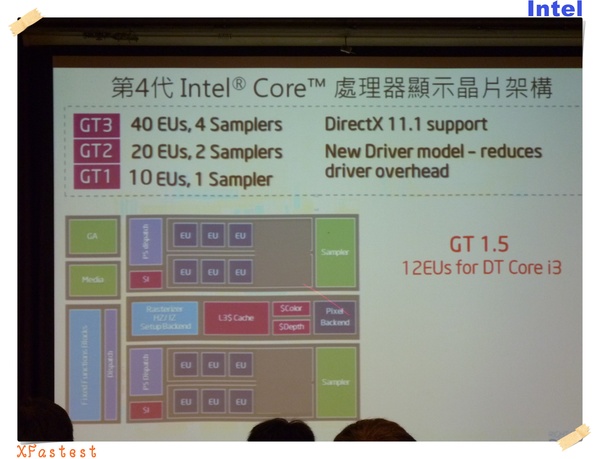 【▼】基本上GT3的架構會是GT2架構的雙層架構,而GT2的架構又會是GT1架構的雙層架構,但Intel針對DT Core i3系列的第四代CPU硬是推出了核心代號為GT 1.5晶片,其架構有12Eus。