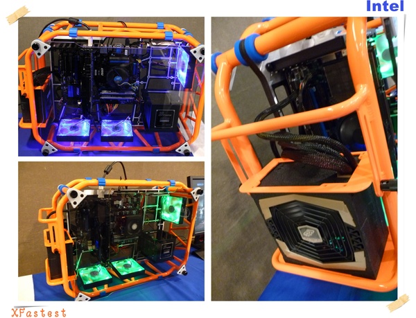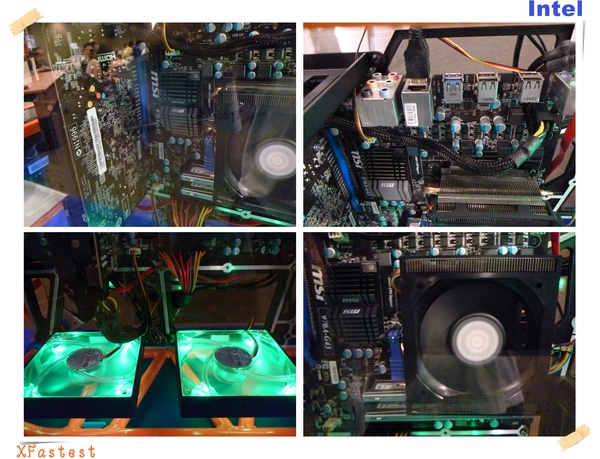 【▼】先來看看兩台測試主機的外觀,主辦單位貼心讓大家辨認,藍色燈風扇為Intel i5-4430,綠色燈風扇為AMD FX-8350,機殼皆用InWin D-Frame的開放式露骨機殼。