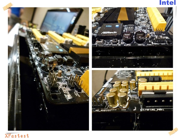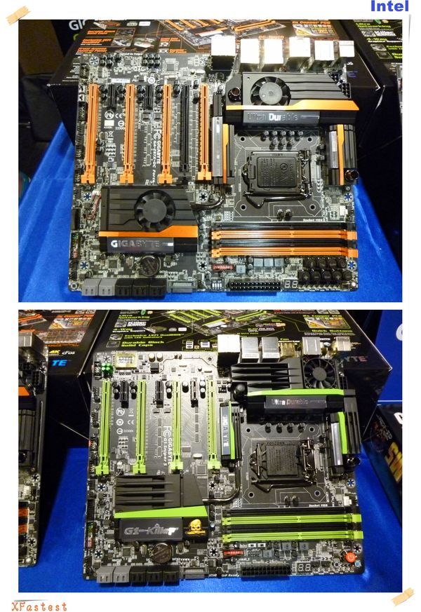 【▼】華碩Z87 Sabertooth系列(黃)及華碩ROG系列(紅)實體展示。