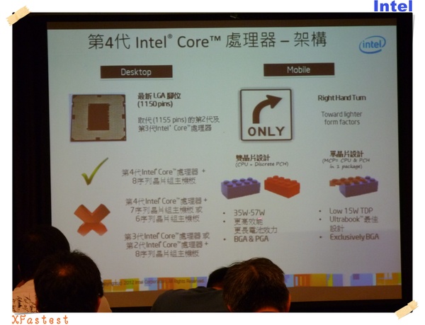【▼】第四代處理器分為兩個部分,一個是傳統桌上型電腦上,另一個是用在行動設備上;桌上型採用最新的LGA 1150腳位,比第二代和第三代少了5隻腳,效能卻大大演進,由於是新腳位,所以需搭配8系列晶片組的主機板,不能沿用6及7系列的主機板;用在行動設備上則分為35W-57W的雙晶片與15W單晶片(適用Ultrabook)設計,功耗更加節能,效能依功耗而有所不同,完全取決於使用者需求。