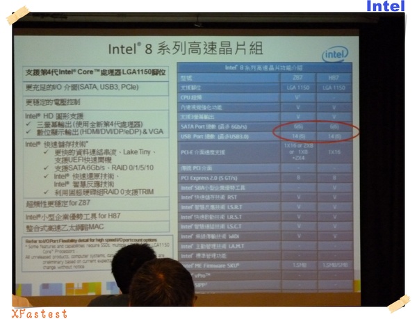 【▼】Intel 8系列高速晶片組特色 ,Jim特別說到SATA Port數最多可達6個(最多6Gb/s,USB 2.0 Port可高達14個、USB 3.0 Port也可達到6個之多。
