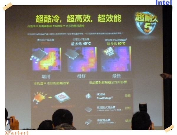 使用IR3550的高開關頻率能力讓輸出電感器和及輸入和輸出電容器的體積縮至最小還簡化了DC-DC轉換器的設計,讓超頻時,溫度比一般電晶體低60度,並能主機板也能很穩定工作。