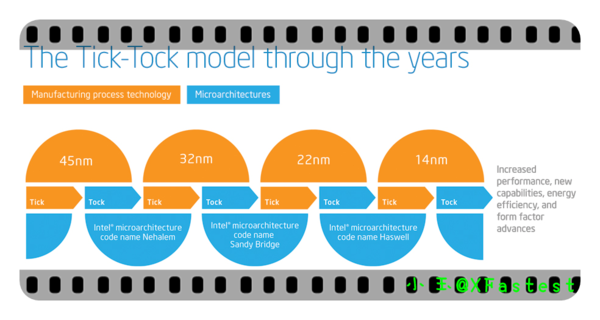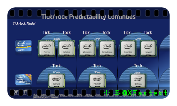 自從2007年開始,INTEL將開發產品策略定為滴答模式(Tick-Tock),這有點像節拍器聲響的策略就是每兩年更新製程一次,讓晶片容納更多的電晶體來作運算,這個叫作Tick階段;那Tock階段呢?因Tick階段是每兩年執行一次,所以Tock階段就是利用這兩年的其中一年來作微架構更新,目前正是邁向14nm的前一個Tock階段,INTEL能否打破摩爾定率明年推出14nm的處理器,就看22nm的Tock階段微架構而定。