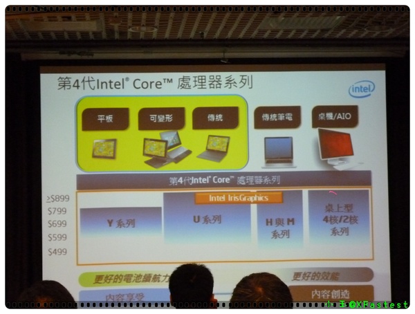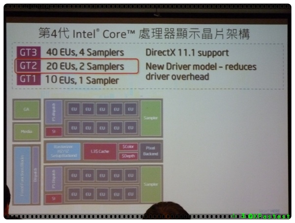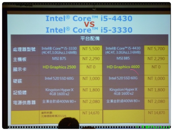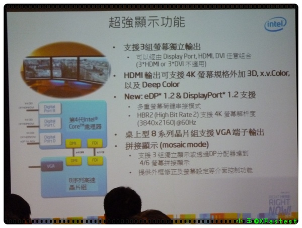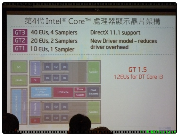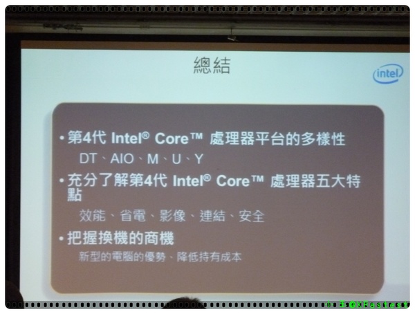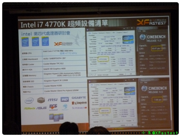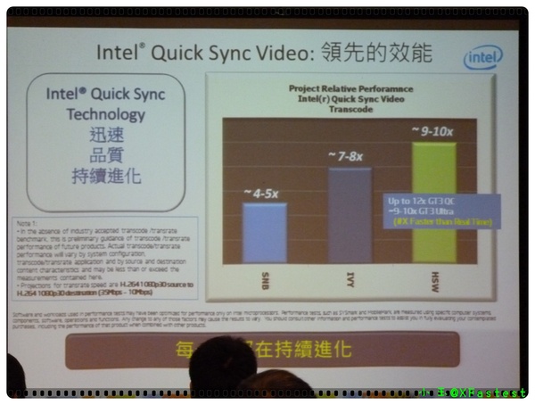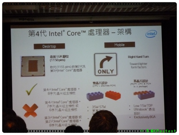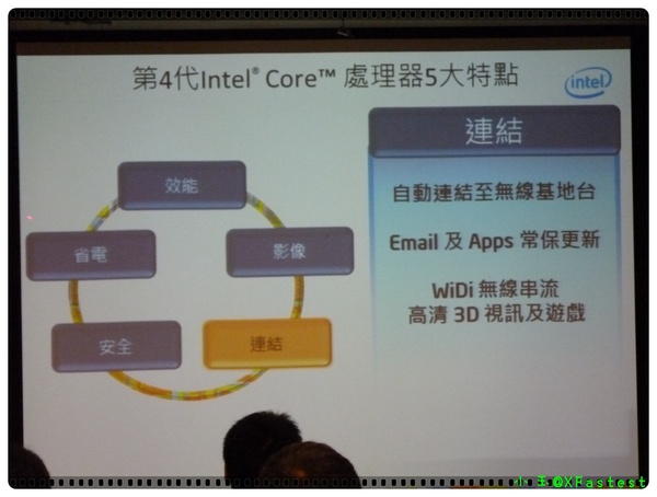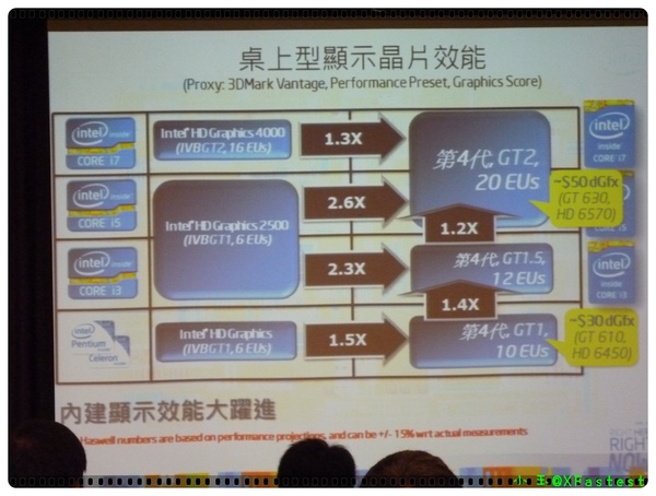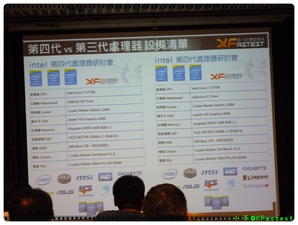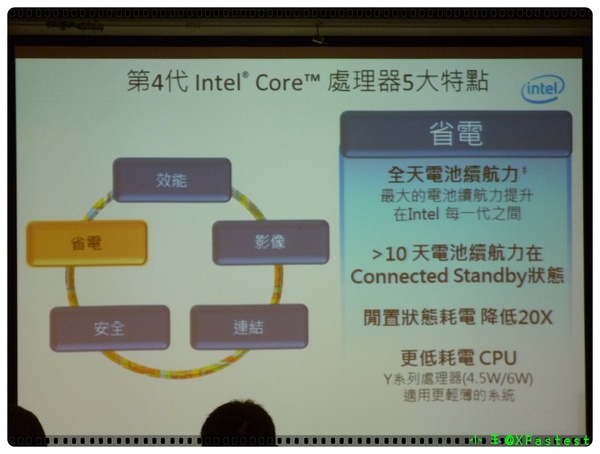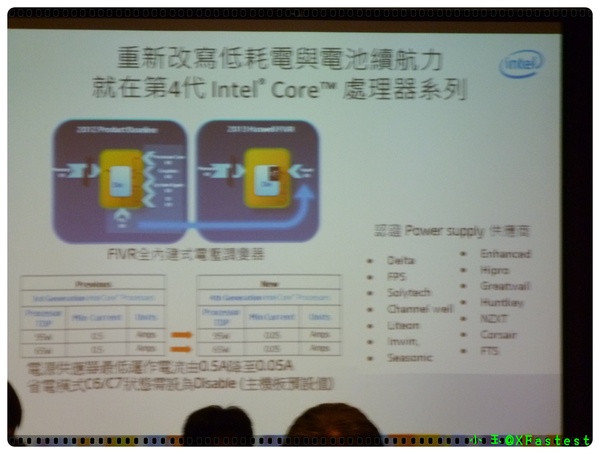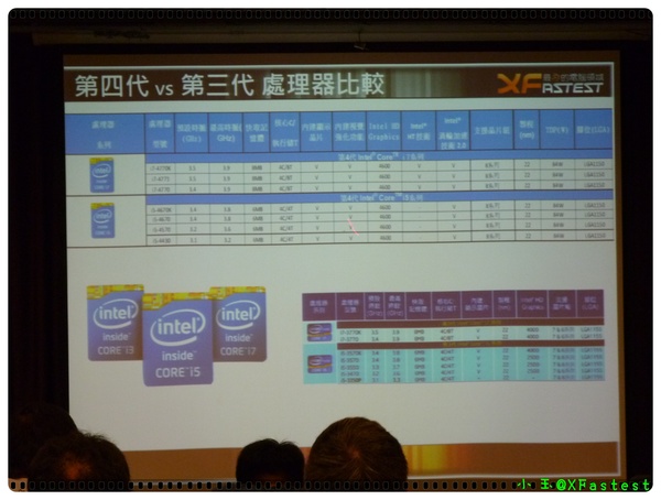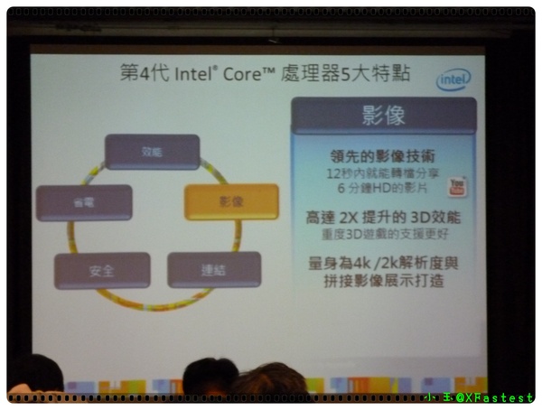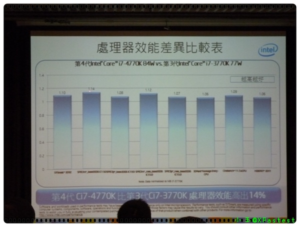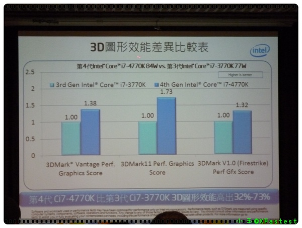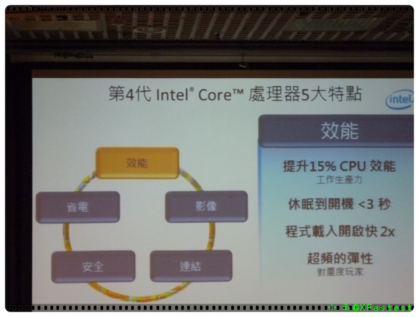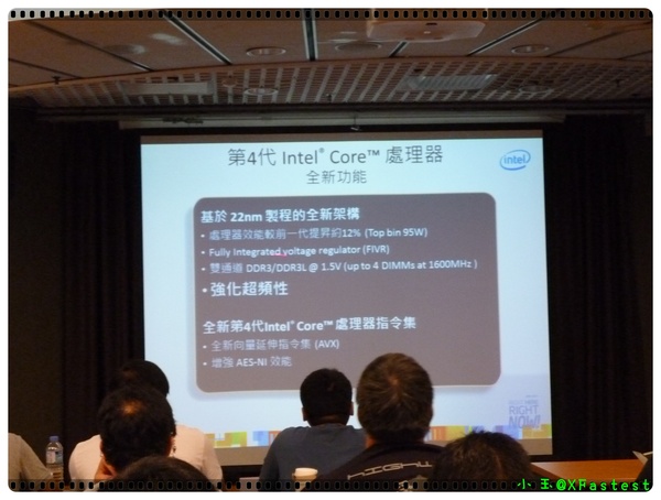 INTEL新推出的第4代處理器叫Haswell (有比較好Has Well),台語可唸成舞咖后,就是22nm的Tock階段的微架構更新產品,在今年的台北國際電腦展中,INTEL宣稱比前一代CPU內顯圖像性能可達2倍效能、耗電少20倍、更可支援3的螢幕,讓人聽了很心動,這次透過XF和INTEL共同舉辦的INTEL第4代處理器研討會,應該就是要來證明不是嘴上説說而已。