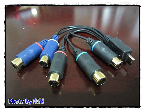 ▼色差端子轉接線,藍色接頭(紅白環)是音源,黑色接頭(藍綠紅環)是影像。