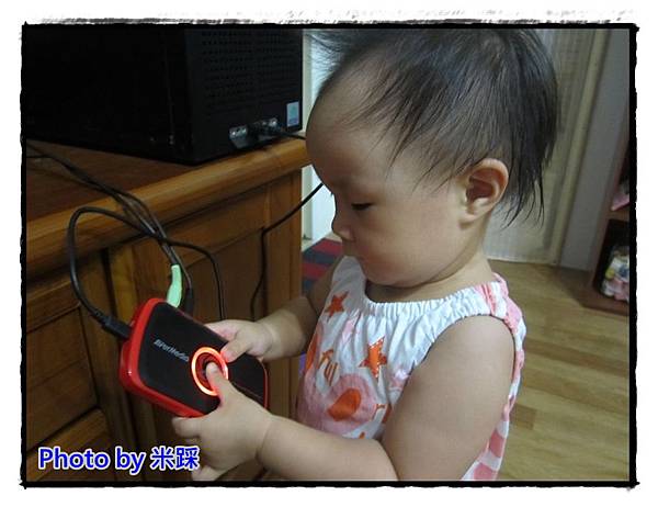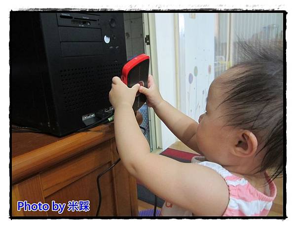 ▼但說時遲那時快,米踩測試過程中遇到最大的危機,米踩的女兒靚靚出現了,並且一把抓住C875易錄盒,開始demo要如何使用.......