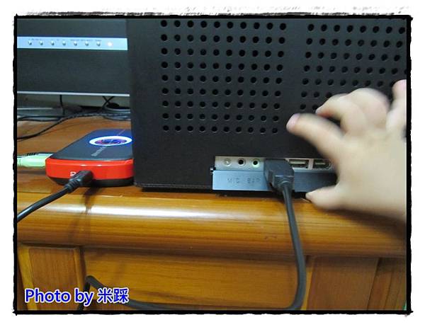 ▼現在開始測試的階段,首先測試電腦錄影的部分,米踩是使用雙輸出的顯示卡,D-SUB接電視,DVI使用DVI轉HDMI轉接線,接C875易錄盒的HDMI IN埠,聲音的部分由電腦輸出接到C875易錄盒的AUDIO IN,再由AUDIO OUT連接電視,眼睛利的看倌會發現電視上顯示的是Windows XP的作業系統,米踩測試後確認軟體無法安裝,於是立馬將電腦安裝成Windows7,之後才開始順利測試。