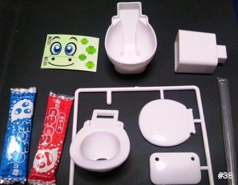 盒裝裡頭附有一個馬桶模型,要食用之前必須先動手將馬桶組裝起來,成為糖果製作的道具。