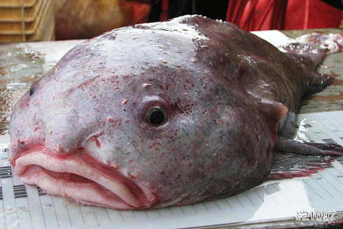 澳洲東南部的水滴魚雖然距住在較深的海裡,但常死於拖網漁船的網子中,你看他的臉好憂鬱.....