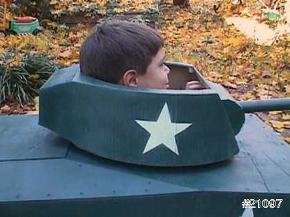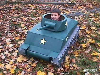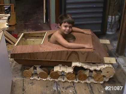 我幫我的五歲大兒子買了台虎王玩具戰車(男人想要小孩的唯一理由是這樣我們就可以玩他們的玩具), 噢, 好吧, 我開始這樣想 " 這東西能夠等比放大到裝下無線控制裝備嗎? 能做成多大的比例? 我說呀, 為什麼不試看看呢? 讓它大到可以把我塞進去然後開來開去? 好好好, 這真的太超過了. 但是要讓我兒子坐進去開來開去算是個很好的理由. 至少這個比我最想做的那件事來得合理多了.想像一下, 當你坐在戰車中隆隆作響地開進鄰居的烤肉派對中他們的臉會怎麼樣, 然後用你的37mm馬鈴薯大炮打中啤酒冰桶, 這應該可以教會他們在七月四日時要喝加拿大啤酒.