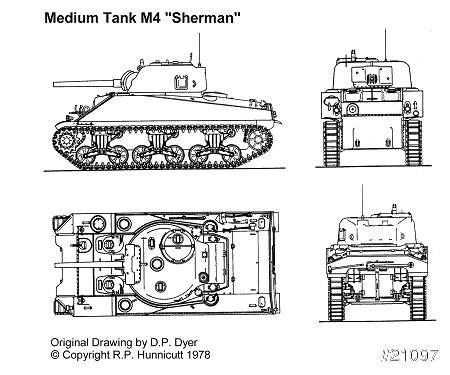 The Sherman was a cool little tank. It was 19'-2" long, 8'-7" wide, 9'-0" tall, weighed 33 tons, carried a crew of five, and had a top speed on a smooth road of 24 mph. The 75 mm gun was replaced late in the war by a more powerful 76 mm gun with a much longer barrel, and some Shermans were equipped with a 105 mm howitzer. The British equipped theirs with 17-pounder (76mm) guns, and called them "Fireflies". The first Shermans had a Continental R974 C4, a 9 cylinder radial aircraft engine! This, in part, is why it was so tall - usually not a desirable characteristic in something people are going to be shooting at. Later versions had other engines, including the unusual "Chrysler Multi-bank", five 6-cylinder engines arranged around a common crank.