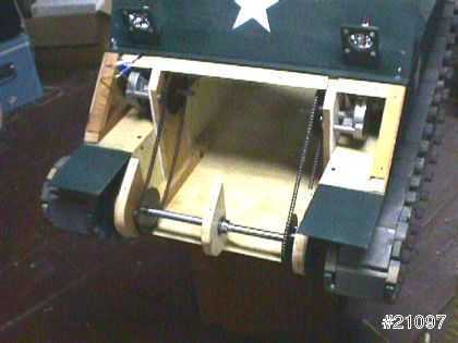 這台模型車的動力源是兩個12伏特75安培航空用深循環電池, 用來驅動兩個24伏特1/5馬力的電動馬達(關於馬達的細節請參閱本頁最底下的說明). 電池併排地放在後面, 馬達則置於履帶上部車身舷側的最前面.經由25號鍊條跟鍊輪齒輪組來驅動前起動輪.(我後來換成35號鍊條跟齒輪組, 看底下說明). 最後會內建24伏特電池充電器及加上用來幫電池室流通空氣的風扇.