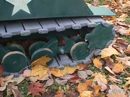 認得出這是什麼嗎? 這是二戰年代的 M4 薛曼坦克車. 大約是五分之一比例, 從履帶開始算是28吋寬(這樣可以通過標準大小的室內門-幾乎啦). 大約四呎長. 除了驅動元件外這完全由木頭打造而成, 就算是履帶也是木製品.