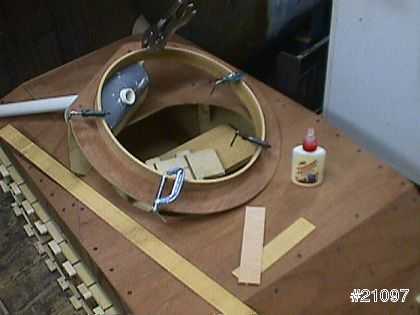 幸運的是在地下室我找到個前任屋主遺留下來的八分之一吋厚的夾板. 這太完美了, 這很容易彎成形狀而且不用花我一毛錢. 我把這夾板切成四塊1.5吋寬36吋長然後用炮塔底部彎曲成形, 上膠並把這兩部件鉗緊成環. 結果長度不夠組成一個圓所以我又換成分開做成180度的部件然後用剩下的材料來補完.