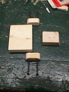 讓它乾燥一晚之後我小心地打磨好再黏上炮塔底部, 然後用自製的木材填充劑(用鋸末加上木工膠)來填補到處都有的未密合裂縫. 炮塔裝上車身上的環而且可以輕鬆轉動, 但是我還是加上了一些從漢堡王玩具上幹來的輪子(漢堡王玩具上到處都有這些小東西), 所以這炮塔環是用滾動的而不是滑動的, 大概浮在車身上約高四分之三吋的地方. 兩根約十六分之三吋的螺絲穿過炮塔環突出到車身底下以確保炮塔的位置 ; 這兩根螺絲裝有彈簧所以可以輕易地壓下然後把炮塔取下.