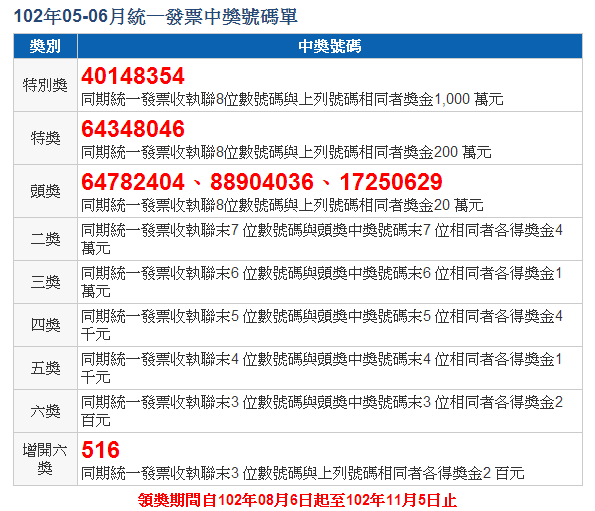 [分享] 102年05-06月統一發票中獎號碼單【5、6月千萬獎 40148354】 生活 · hahahabeta · 發表於 2013-07-25 14:29 · · 檢舉 列印版 twitter plurk 1.8萬閱讀次數 資料來源財政部 回家趕快對對看(或打開妳的電子信箱看電子發票)妳中獎了嗎 讚 收藏 快速回應 引言回應 登入來回應 header home