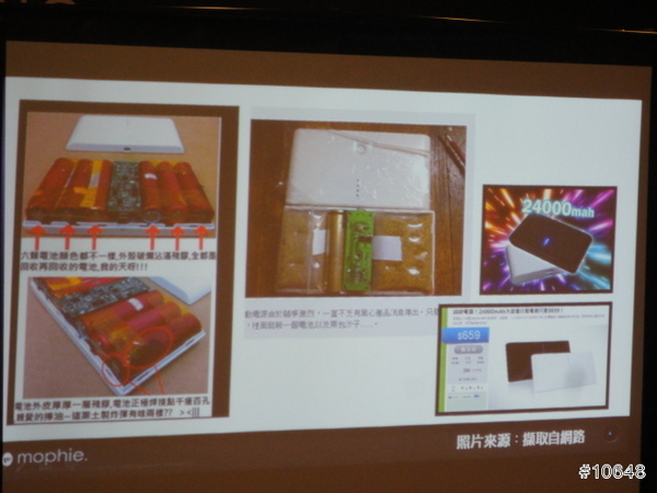 ▼ Tim哥說明夜市買的行動電源,很可能就會遇到的問題,如回收電池老舊生鏽,不然就是以沙子充當重量,讓消費者以為內部用料是很實在的錯覺