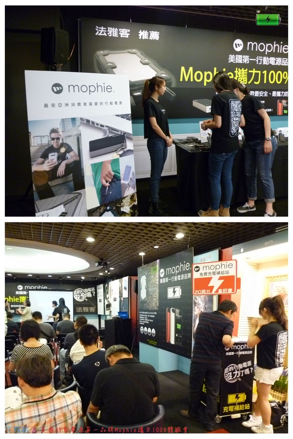 【▼】Mophie和T客邦的工作人員再作最後的確認,在此感謝他們對整個活動的流程掌握得宜;會場還有免費充電補給站,讓大家親眼見證什麼叫做快速充電。