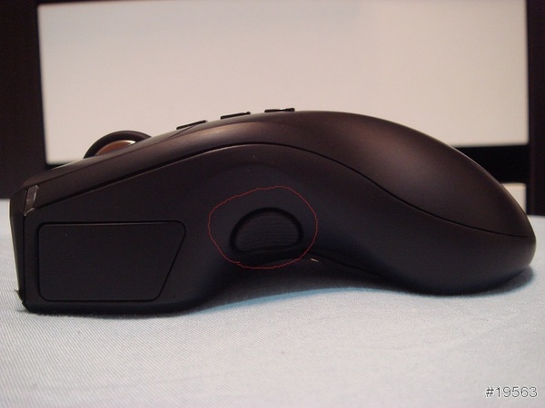 左測中間有設置了一個空中滑鼠的開啟按鍵,只要持續按著這個按鍵的時候,在空中上下左右移動滑鼠就可以操作鼠標的位置。若是持續在空中滑鼠模式下操作的話,只要連按兩下開啟按鍵,就可以讓簡報鼠保持空中操作的模式,不用再一直壓著這個功能按鍵。(紅圈處)