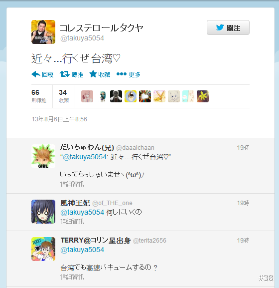 以高速真空吸引一戰成名的拓也哥,在台灣的人氣強強滾。不斷的有網友、明星前往日本與拓也哥拍照。也許是有腦筋動得快的商人看上了拓也哥的超人氣吧,拓也哥今天在他的Twitter上宣布,他最近要來台灣啦! 日本網友也相當捧場地要拓也哥發揮他的長才,來征服台灣粉絲: 總之,不管你對拓也哥的評價如何,他是來定了!就讓我們等待本尊囉。 拓也哥的Twitter:https://twitter.com/takuya5054/status/364777069084811264 7 個人說讚 收藏 快速回應 引言回應 共 1 則回應 1 樓 · 史蒂薇 · 發表於 2013-08-08 14:56 · 檢舉 「多謝招待~~」...拓也哥有禮又嬌羞的模樣,深深印在腦海裡啊 (≧▽≦) 讚 引言回應