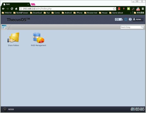 接著用瀏覽器直接連接Thecus N2520試看看,只要在瀏覽器輸入Thecus N2520的IP位置即可連到(需在同一個網段)
