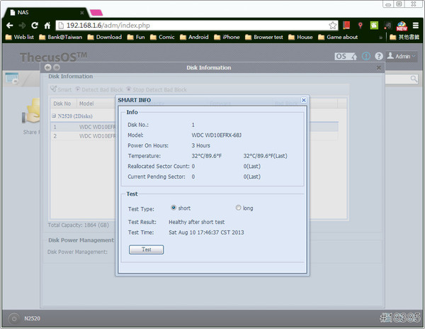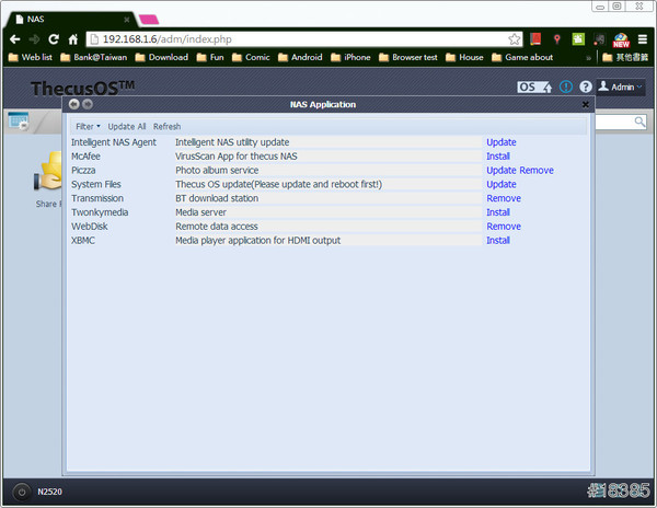 Thecus N2520的功能比起我之前買的NAS好很多,不管你是要用瀏覽器連線、專屬程式連線或檔案總管連都OK,還可獨立接電視播放照片、影片和音樂,甚至於看氣象等……不過價格也高上一些,但以它的規格與實用性來說,小弟是覺得值得,另外它還標榜支援iOS/Android系統,可,並透過iOS or Android設備上傳/下載/瀏覽網路儲存設備(NAS)裡的檔案,真的很好玩。
