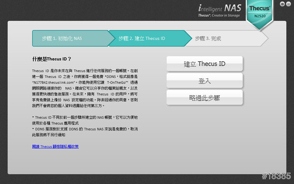 看要不要註冊用ThecusID(DDNS),目前不用就略過,建議花點時間去註冊啟用這服務比較好,這樣在外連線或是開放給別人連線都很方便,不用記IP位置